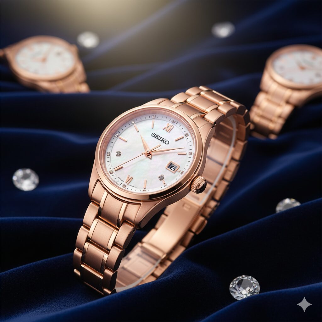 - 落ち着いたカラーリング: 派手すぎる色よりも、シルバーを基調とした清潔感のあるモデルや、肌なじみの良い上品なピンクゴールド(例: SSVV020)が好まれます。文字盤の色も、ホワイト、シルバー、シャンパンゴールドなど、針がはっきりと見える明るい色がおすすめです。