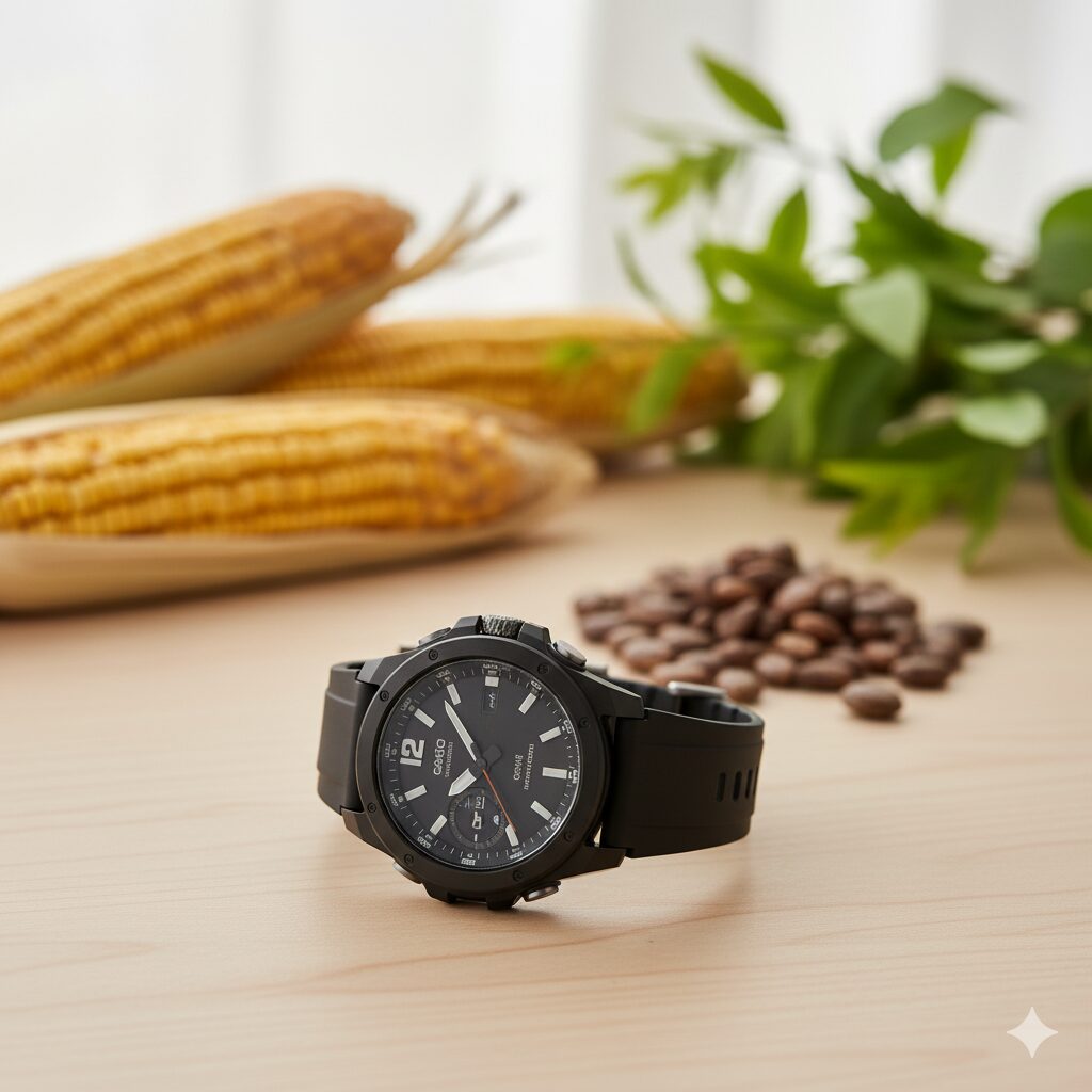 このPRW-61や後継のPRW-51は、ケースやバンド、裏蓋に「バイオマスプラスチック」という、トウゴマの種やトウモロコシなどから抽出した再生可能な有機資源を原料とする樹脂を使用しています。環境負荷低減に配慮したこういう姿勢も、時計を選ぶ上での一つの大切なポイントになりますよね。