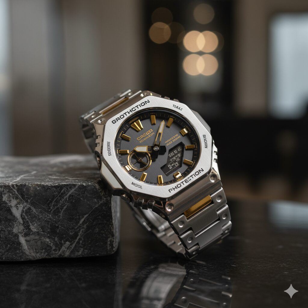 「カシオークのデザインは好きだけど、樹脂のカジュアル感がちょっと…」という方には、フルメタル化した「GM-B2100」がおすすめです。樹脂モデルの軽快さとは打って変わって、ステンレススチールのずっしりとした重量感と輝きは、もはや高級時計のそれです。