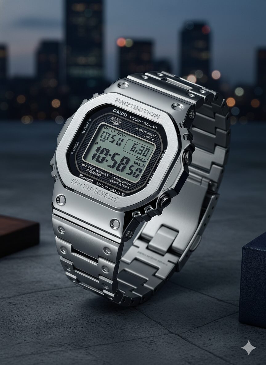 見た目は誰もが知るG-SHOCKのクラシックなスクエアデザインなのに、素材が金属になるだけで、これほどまでに高級感と「大人の道具感」が出るとは、と私も初めて見たときは驚きました。