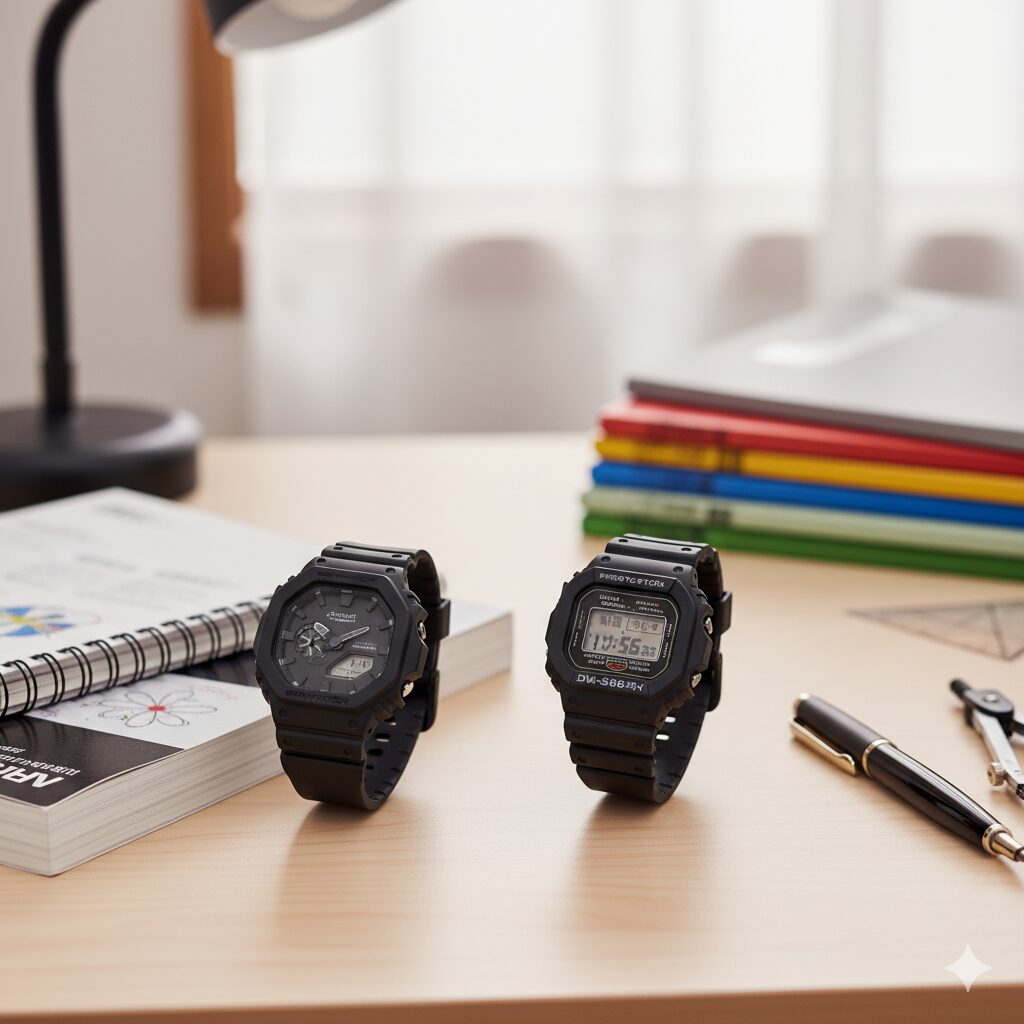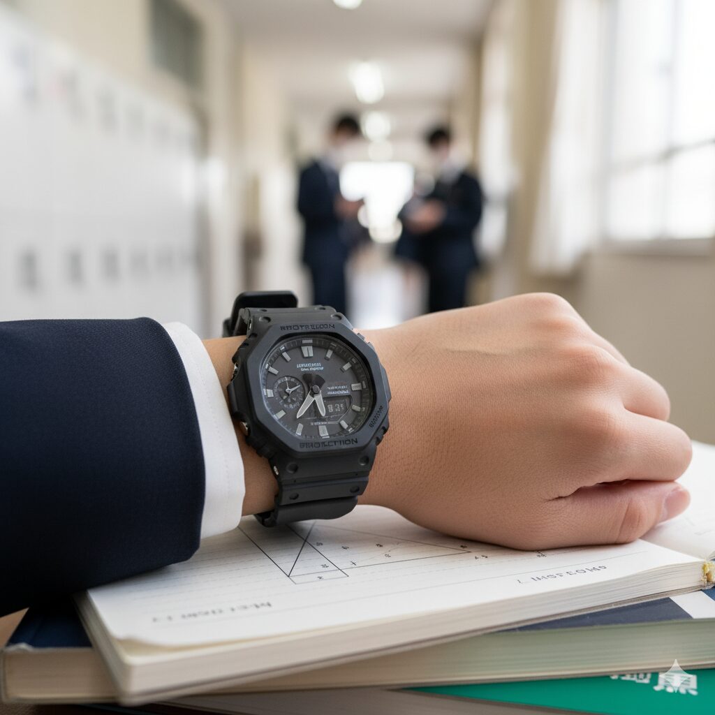 男子の定番は薄型で使いやすい八角形のGA-2100系と、スクエアのDW-5600系です。特にGA-2100-1A1JFはマットなオールブラックで制服にも私服にもなじみやすく、軽さと薄さが授業中の着け心地にも効きます。