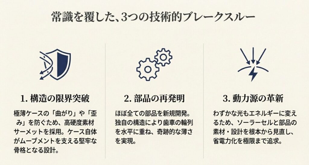 一見すると普通に見える薄いケースの中に、85個もの部品からなる極薄ムーブメントを封じ込め、1.00mmの宇宙を形成しているのです 。この「内に秘めた知性」こそが、所有者に静かな自信を与えてくれます 。