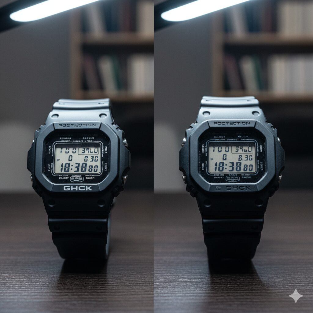 - 素材:フルメタルやG-STEELなどの金属外装が王道。マットな樹脂素材でも、質感が均一であるほど高見えします。光沢が強すぎる樹脂はカジュアルに寄るため、落ち着いたヘアライン加工やつや消し仕上げが理想的です。