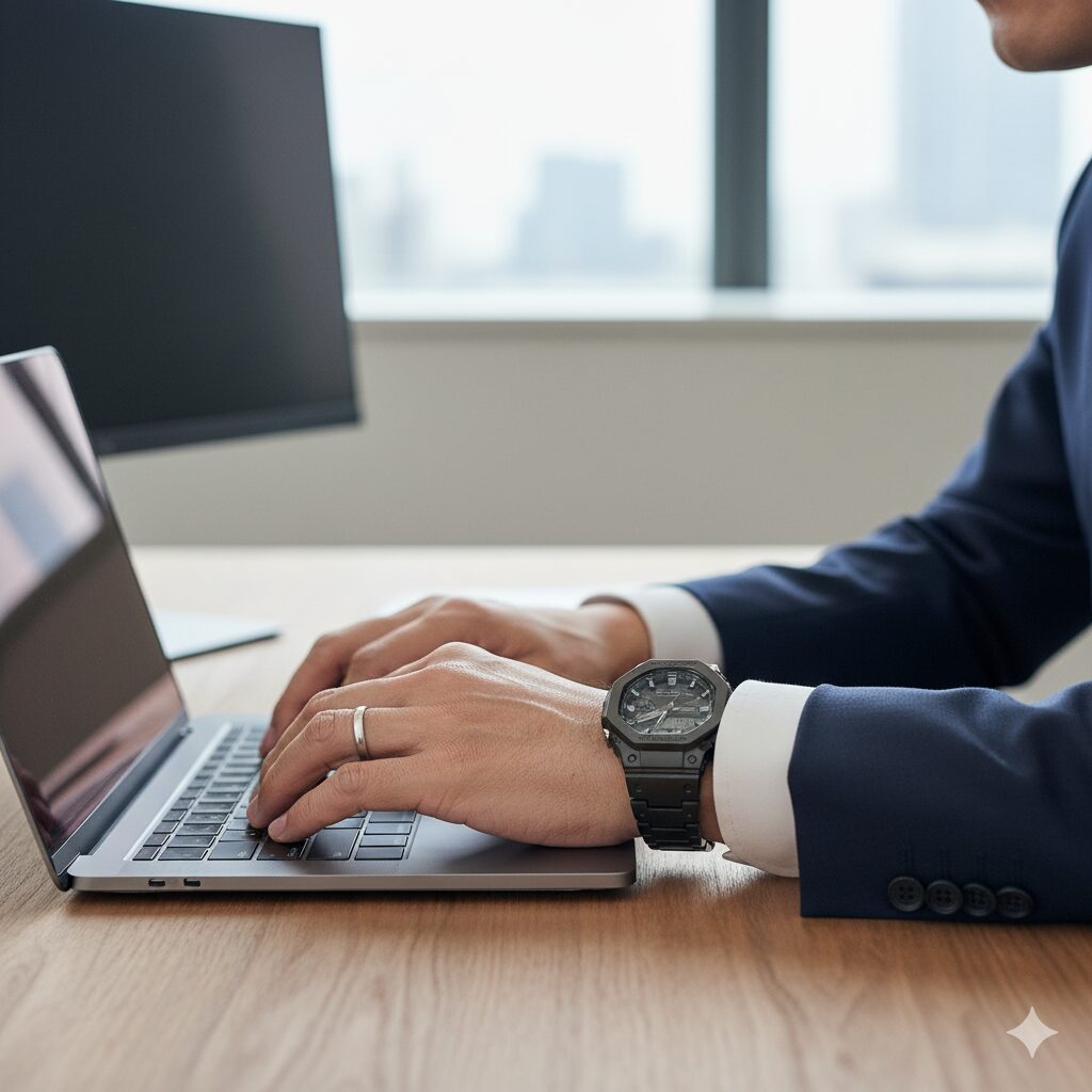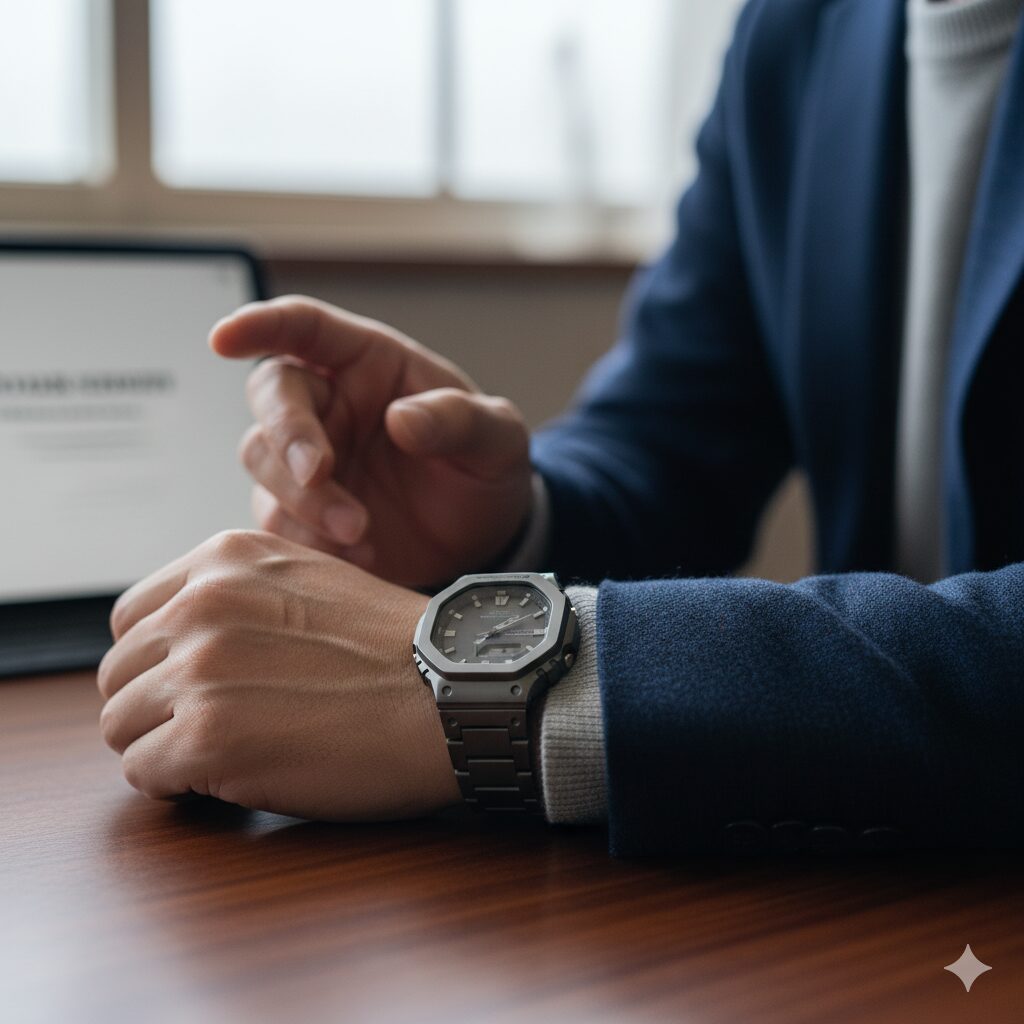 ビジネスの場でG-SHOCKを取り入れる際に大切なのは、「清潔感・統一感・控えめな主張」の3つです。高級時計に見劣りしない“整った見え方”を作ることがポイントです。