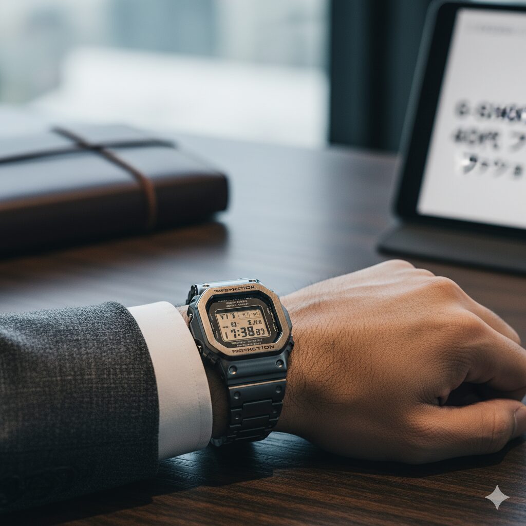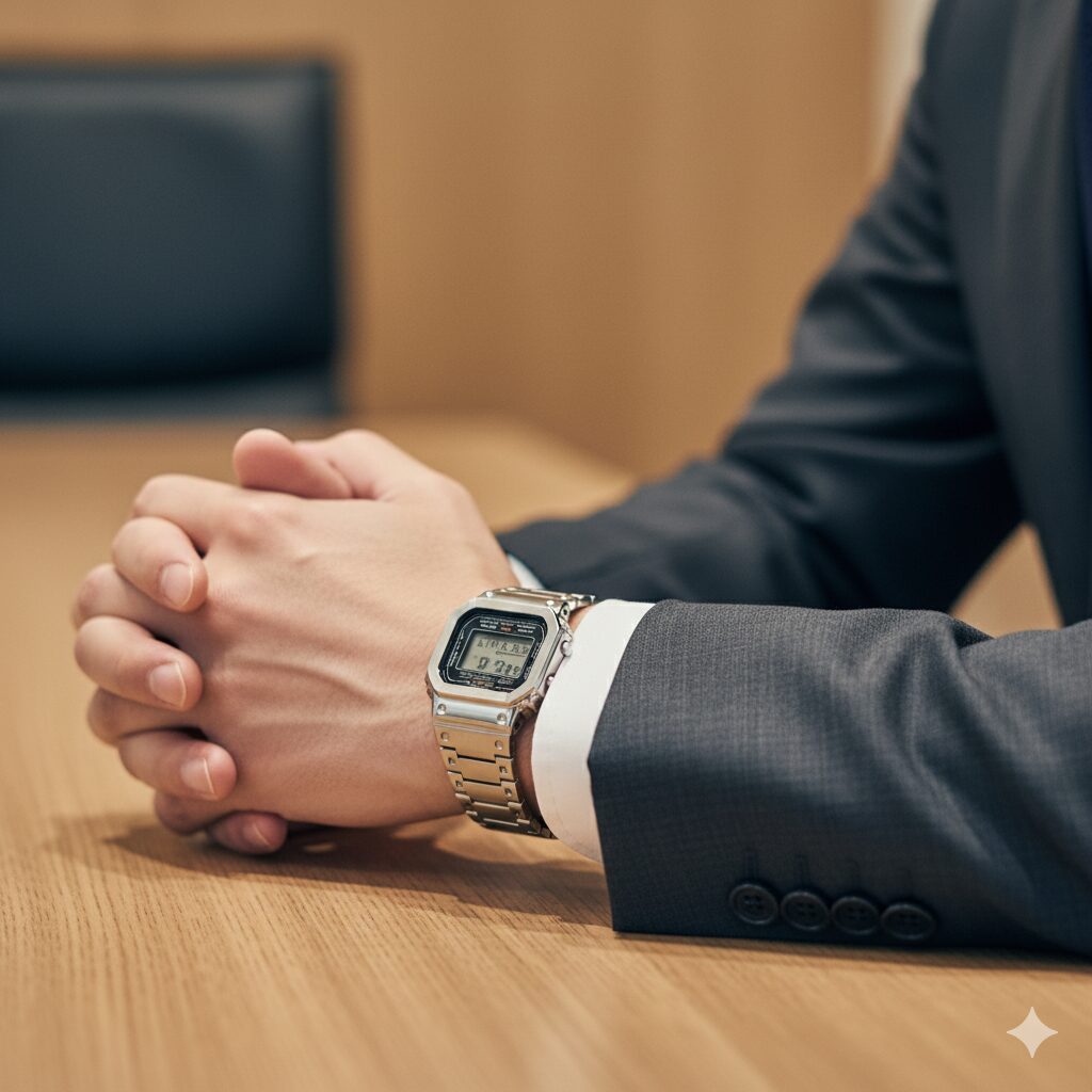 ポイント:ビジネスでは“目立つ時計”ではなく、“馴染む時計”を選ぶことが重要。G-SHOCKでも控えめな色味・薄型・金属外装を意識すれば、立派なフォーマルウォッチになります。