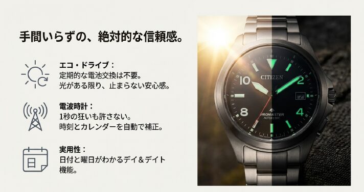 ここからは、シチズンプロマスターランドAT6085-50Eそのものの特徴を、できるだけシンプルに整理していきます。