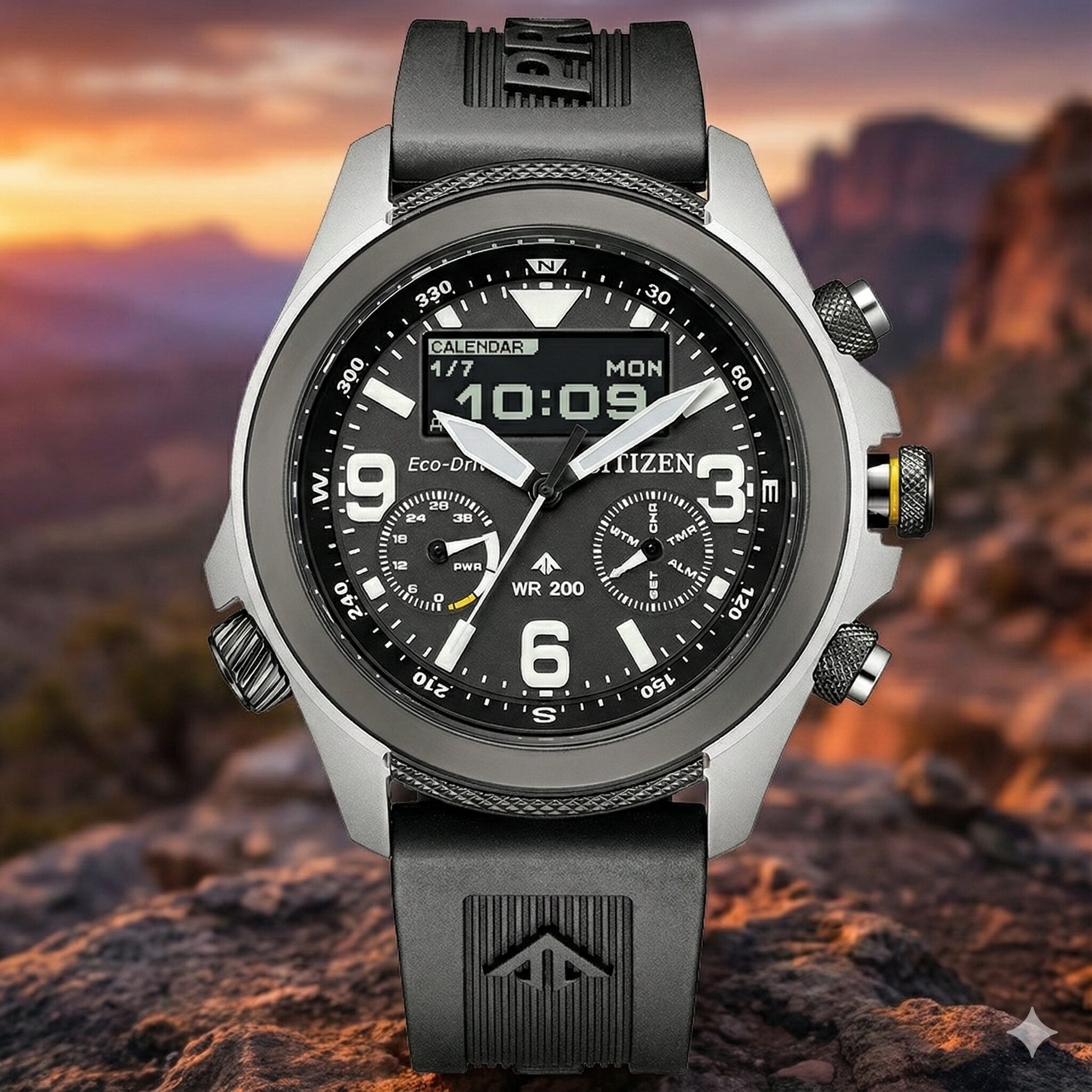 アナログ時計の直感的な視認性と、デジタル時計の圧倒的な機能性。この二つを高い次元で融合させたフィールドウォッチとして注目を集めているのが、シチズン プロマスターランド JV1007-07Eです。