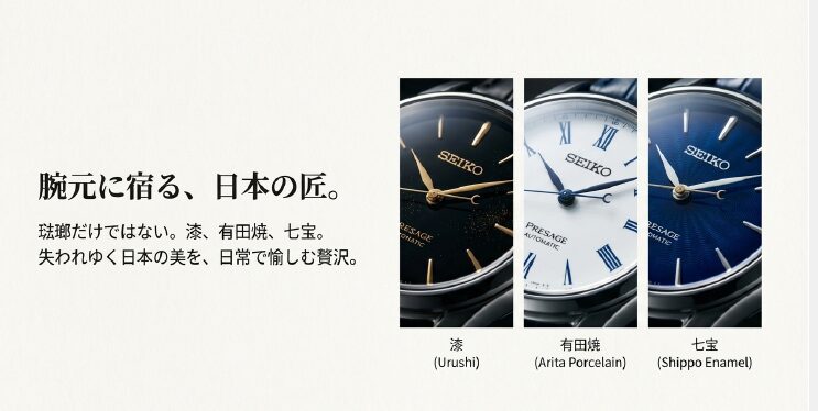 他にも「漆(うるし)」や「有田焼」「七宝(しっぽう)」など、日本の匠の技を腕元で楽しめるのはプレサージュならではの特権ですね。これらは単なる実用品を超えた、所有する喜びを感じさせてくれる美術品としての価値も持っています。