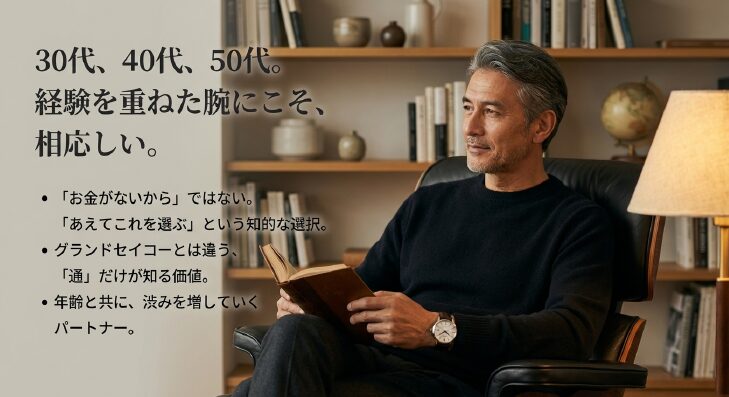 - 長く付き合える安心感:30代から50代、60代となっても腕元に馴染む普遍的なデザイン。そして国内ブランドならではのメンテナンス体制の良さが、あなたの時計ライフを長期的に支えてくれます。
