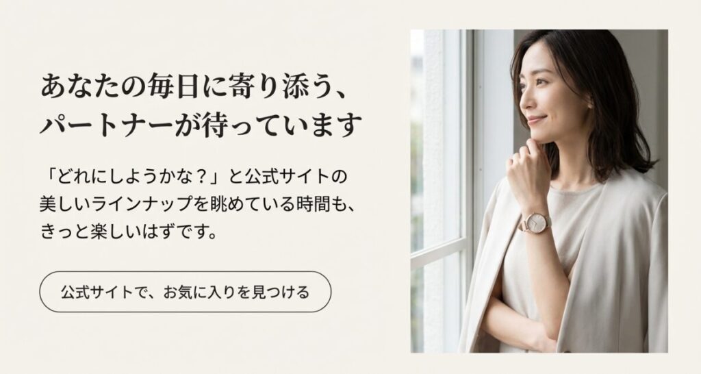 | 40代以降 | マザーオブパールの文字盤など、質感の良いモデルを。手首を華奢に見せ、品格を底上げしてくれます。落ち着いた色のベルトを選ぶのがコツ。 |