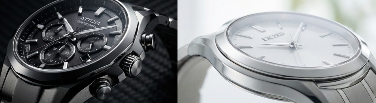 まず結論からお話しすると、アテッサとエクシードは、同じ「シチズンの技術(スーパーチタニウムやエコ・ドライブ)」という食材を使いながら、全く異なるレシピで作られた料理のようなものです。