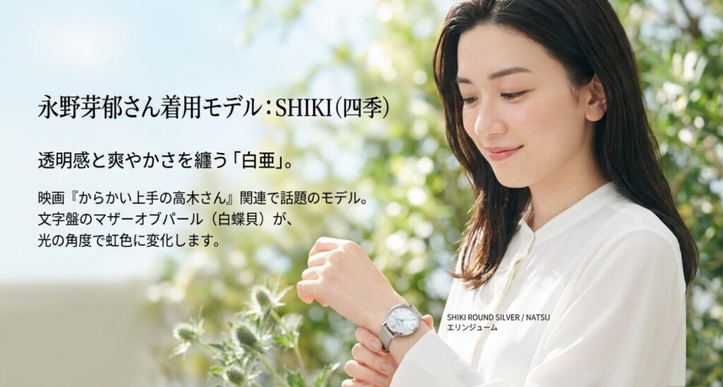 「日常の何気ない瞬間を、ドラマのワンシーンのような高揚感で彩りたい」という方には、永野芽郁さんの着用情報として紹介されたSHIKI ラウンドがおすすめです。