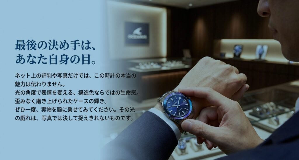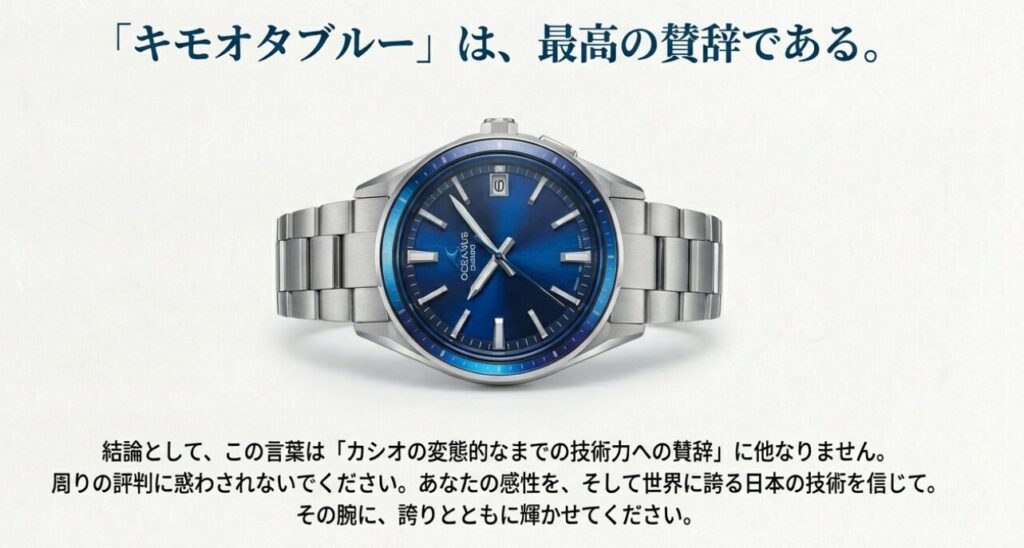どうぞ、誰かが作った言葉の呪縛から解き放たれてください。そして、自分の感性と、世界に誇る日本の技術力を信じて、ぜひその腕にオシアナスの青を輝かせてください。その選択は、きっとあなたのビジネスライフにおける、密かな、しかし確かな誇りになるはずです。